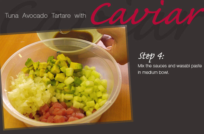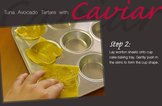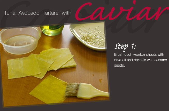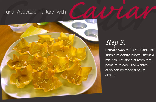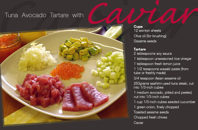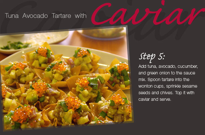 2) Add tuna, avocado, cucumber, and green onion to the sauce mix. Spoon tartare into the wonton cups, sprinkle sesame seeds and chives. Top it with caviar and serve.